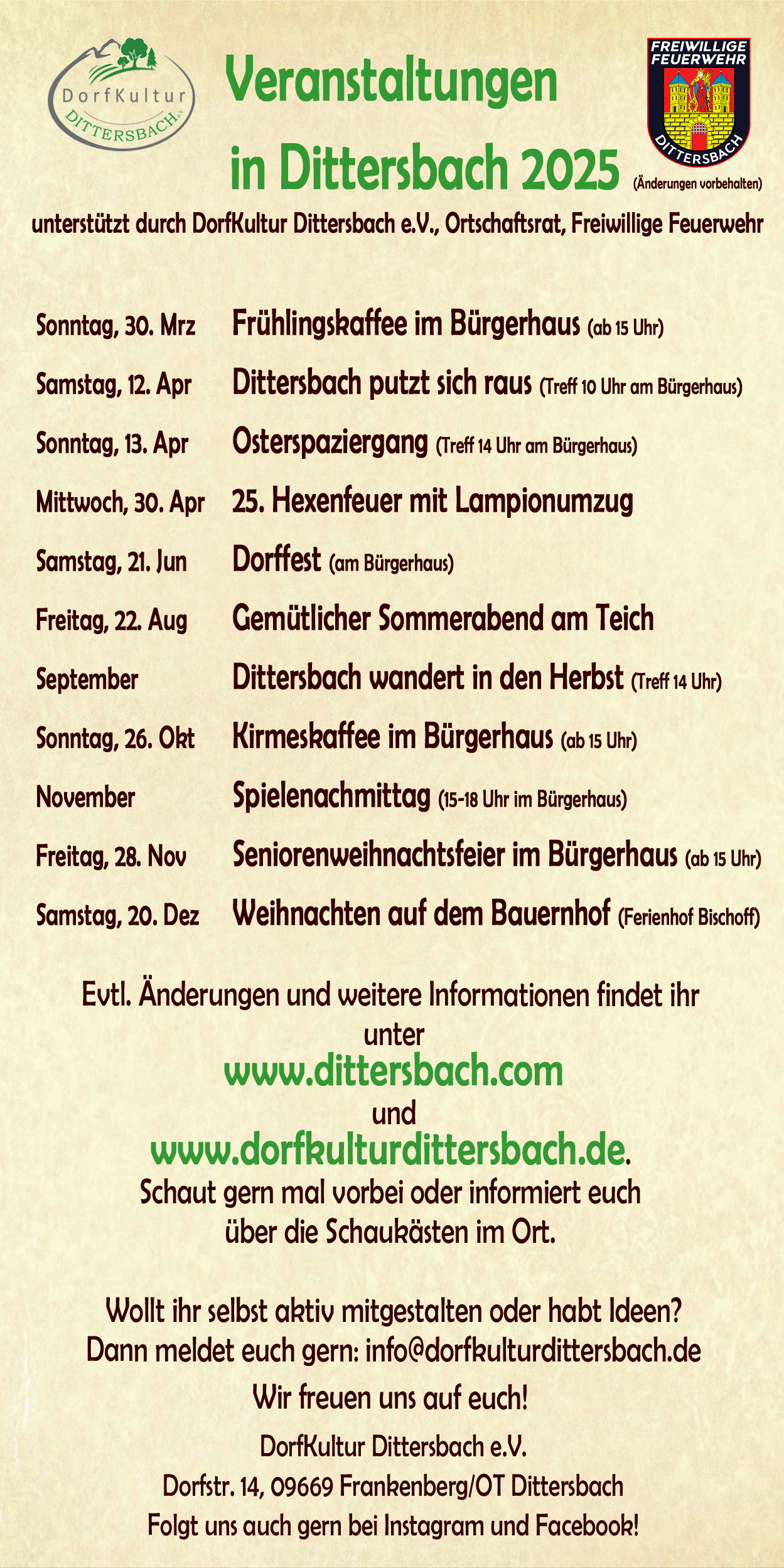 Wir sind ein gemeinnütziger Dorfverein aus Dittersbach und wir engagieren uns für unsere Heimat und das Zusammenleben in unserem Dorf.